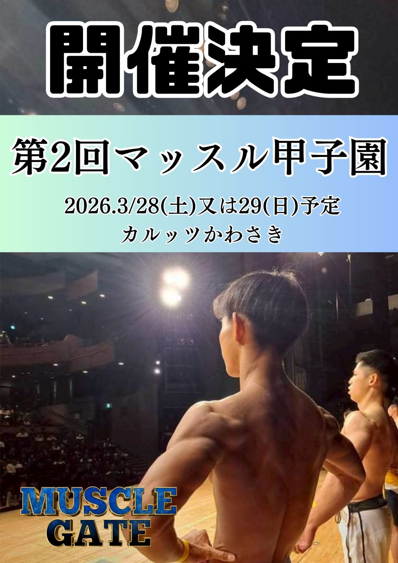 第2回マッスル甲子園は、2026年3月28日(土)・29日(日)開催のマッスルゲート神奈川大会(会場:カルッツかわさき)にて実施いたします。