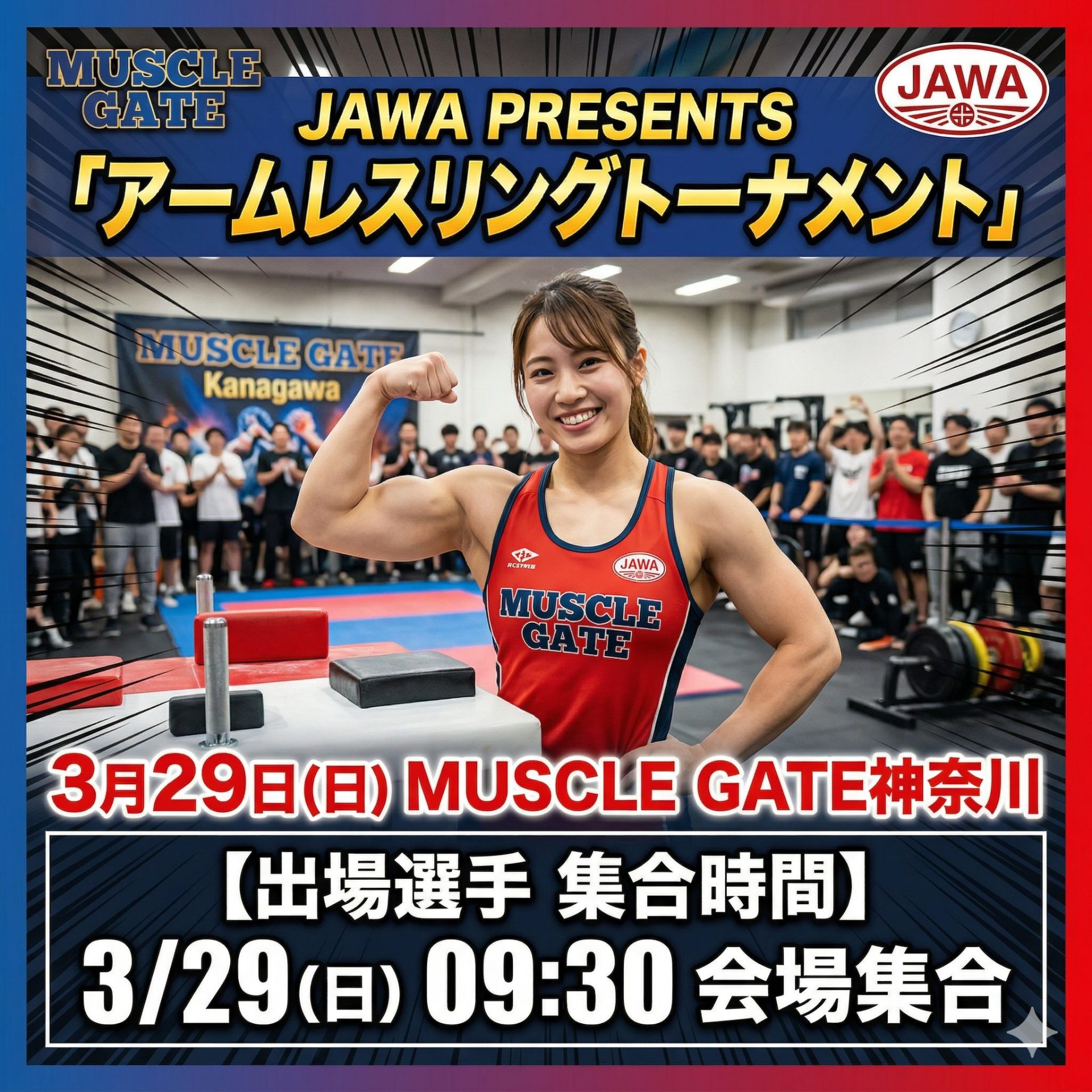 3月29日(日)に開催される「MUSCLE GATE 神奈川 JAWA PRESENTS アームレスリングトーナメント」に出場される選手の皆様に、集合時間のご案内を申し上げます。